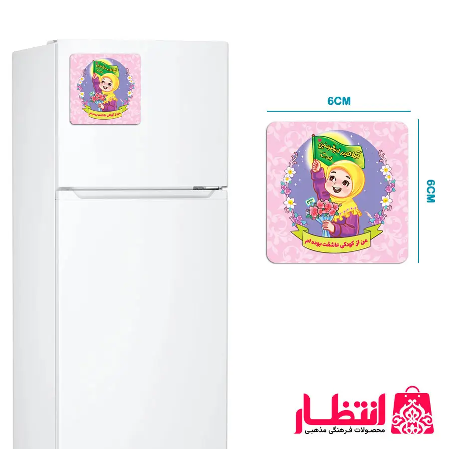 مگنت دخترانه من از کودکی عاشقت بوده ام جنس این محصول از نوع مگنت لاستیکی در ابعاد 6×6 سانتیمتر میباشد. که میتوان آن را روی سطوح فلزی مانند درب یخچال، درب کمد و… قرار دارد. شما میتوانید از این مگنتها به عنوان هدیه در روز عید غدیر خم استفاده کنید.